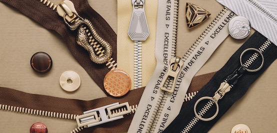 Luxury tries to dress in simplicity but cannot hide from the discerning eye: classic gold, black, beige and dark brown colors, geometric and sinuous shapes that eschew static betray its nature, pure elegance. Elegantly basic or metalized tapes in gold and with glossy black enamels, PVD (Physical Vapour Deposition) body and puller finishes, the patented TRA-IN stainless steel button with Coeurdor’s light gold finish, and customized branding, ELOXAL chain with aluminum teeth colored in gray and gold: revisited and enhanced visions of the classic, on the heels of the Quiet Luxury trend. The gleam of metal is counterbalanced by the simplicity of wool yarn, GRS-certified recycled polyester and GOTS-certified organic cotton, for a final effect of utter class.
